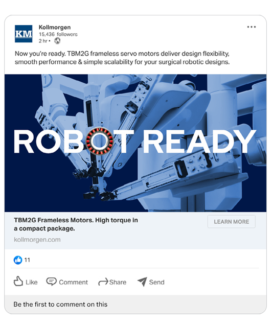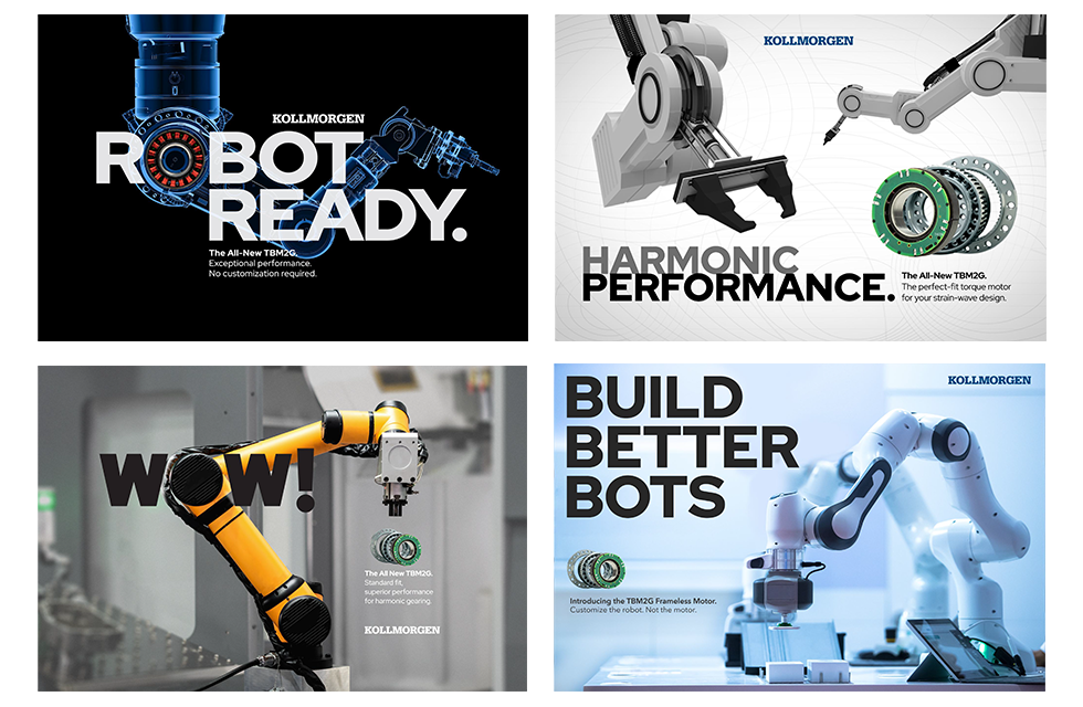 Kollmorgen is a global leader in motion systems across a wide array of industries. The company introduced a turn-key torque motor for the robotics market called the Kollmorgen TBM2G. My team developed a simple yet powerful theme for the introduction, “Robot Ready.” This memorable line encapsulated the motor’s unique value and formed the nucleus of an expanded integrated launch.